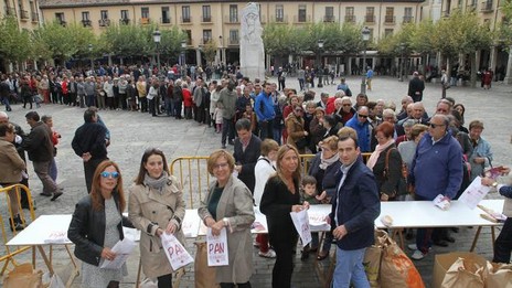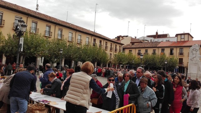 Una larga fila rodeaba la Plaza Mayor desde antes de las 13:30 horas de del domingo 16 de Octubre de 2016, momento previsto para el reparto gratuito de fabiolines, organizado por la Asociación Provincial de Fabricantes con motivo del Día Internacional del Pan.